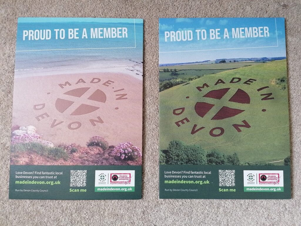 These free A4 sized table talkers are great for displaying at market stalls, reception desks or anywhere you’d like to showcase your membership of Made in Devon. There are two different designs. To order just email ma